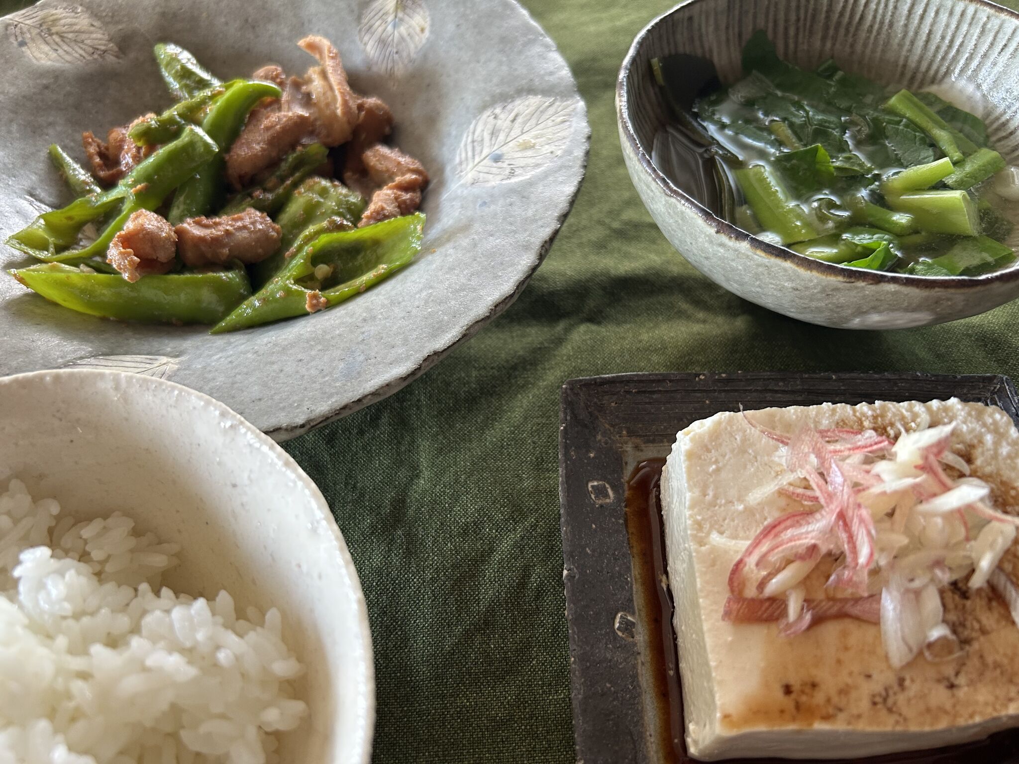 トンチャン(岐阜名産の味付け腸モツ)と辛くないシシトウ炒め、味噌汁の具はムラサキツユクサです