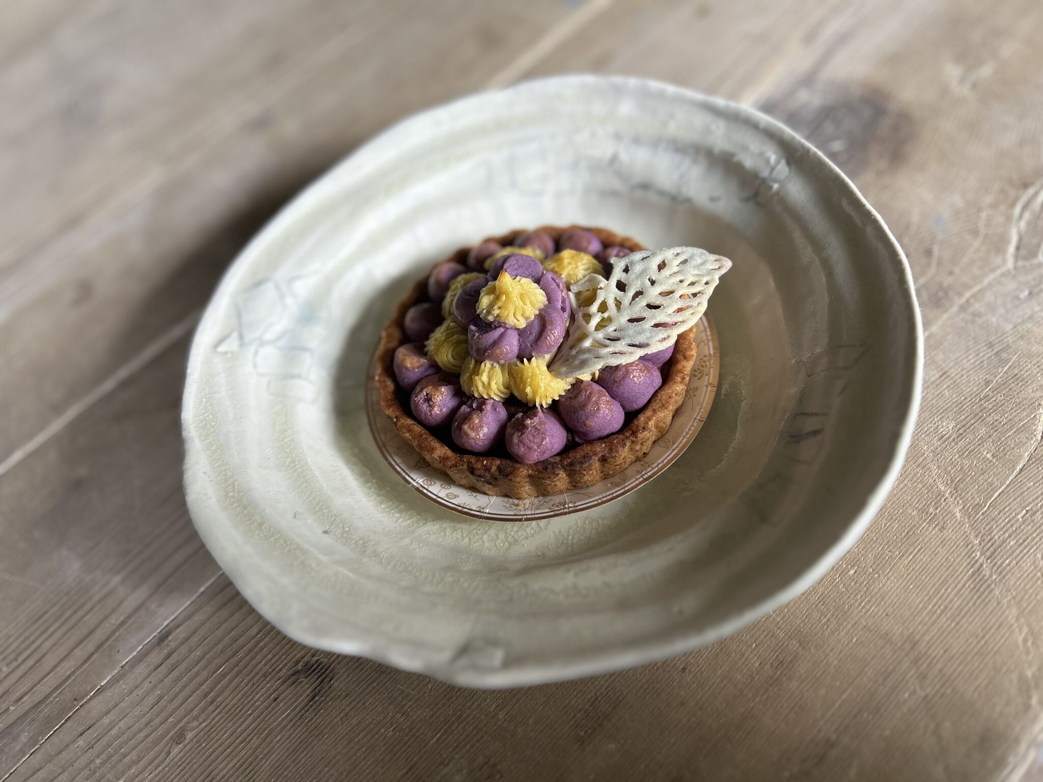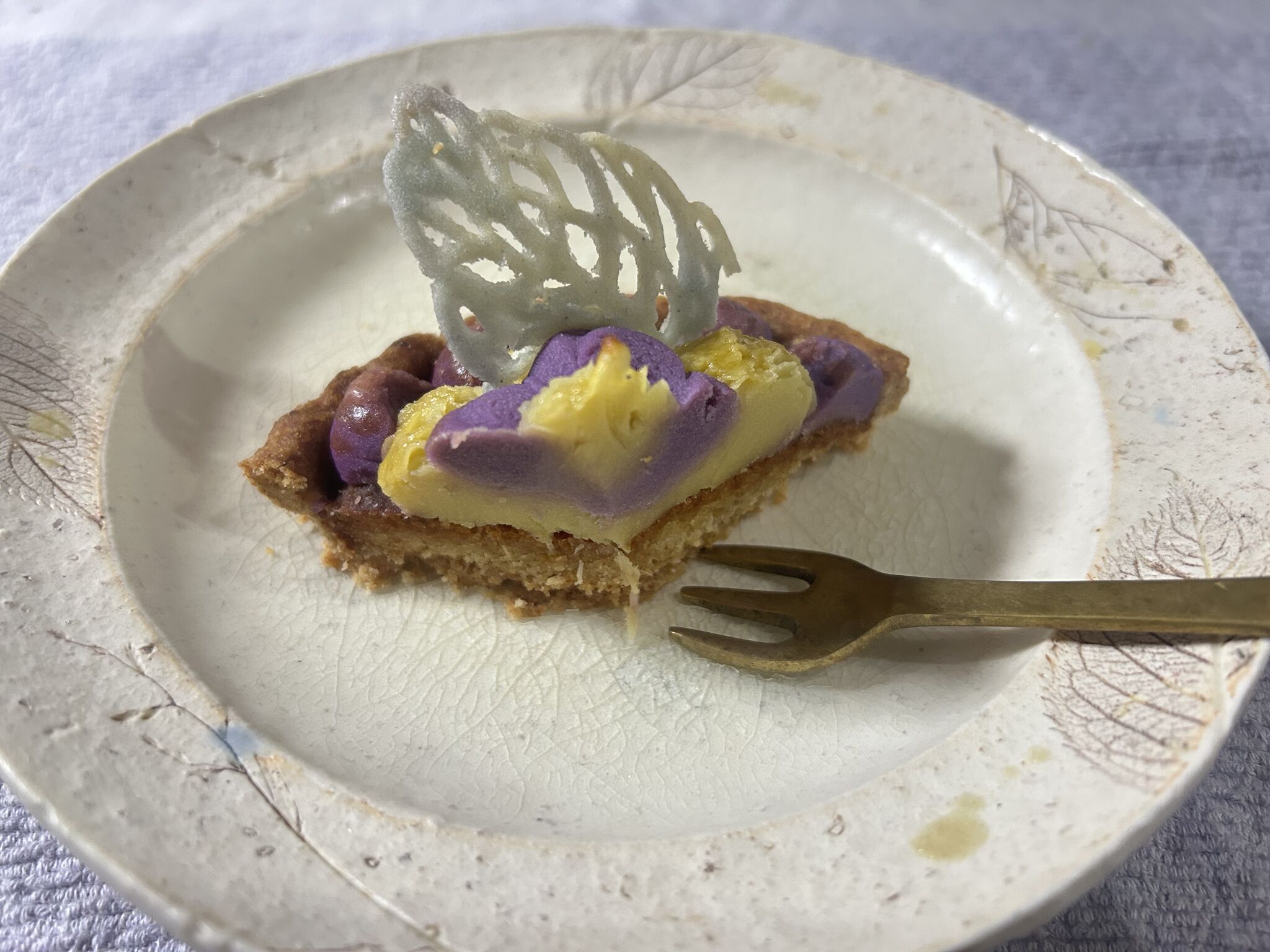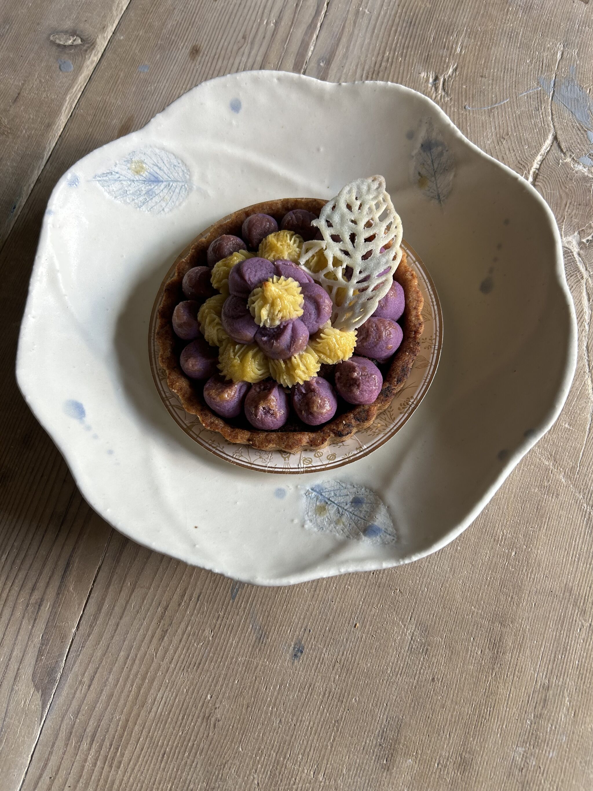 今回は琴絵さんの日本画に細かく描かれたレースにちなんで、葉っぱのレースをちょこんとあしらった2色のスイートポテトタルトでした。