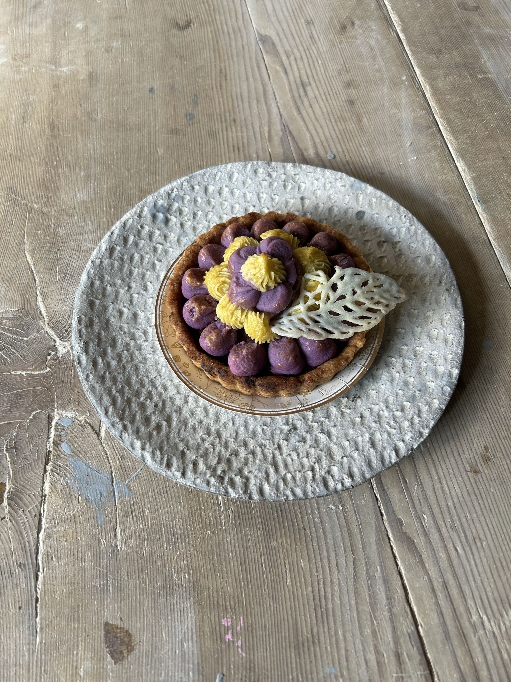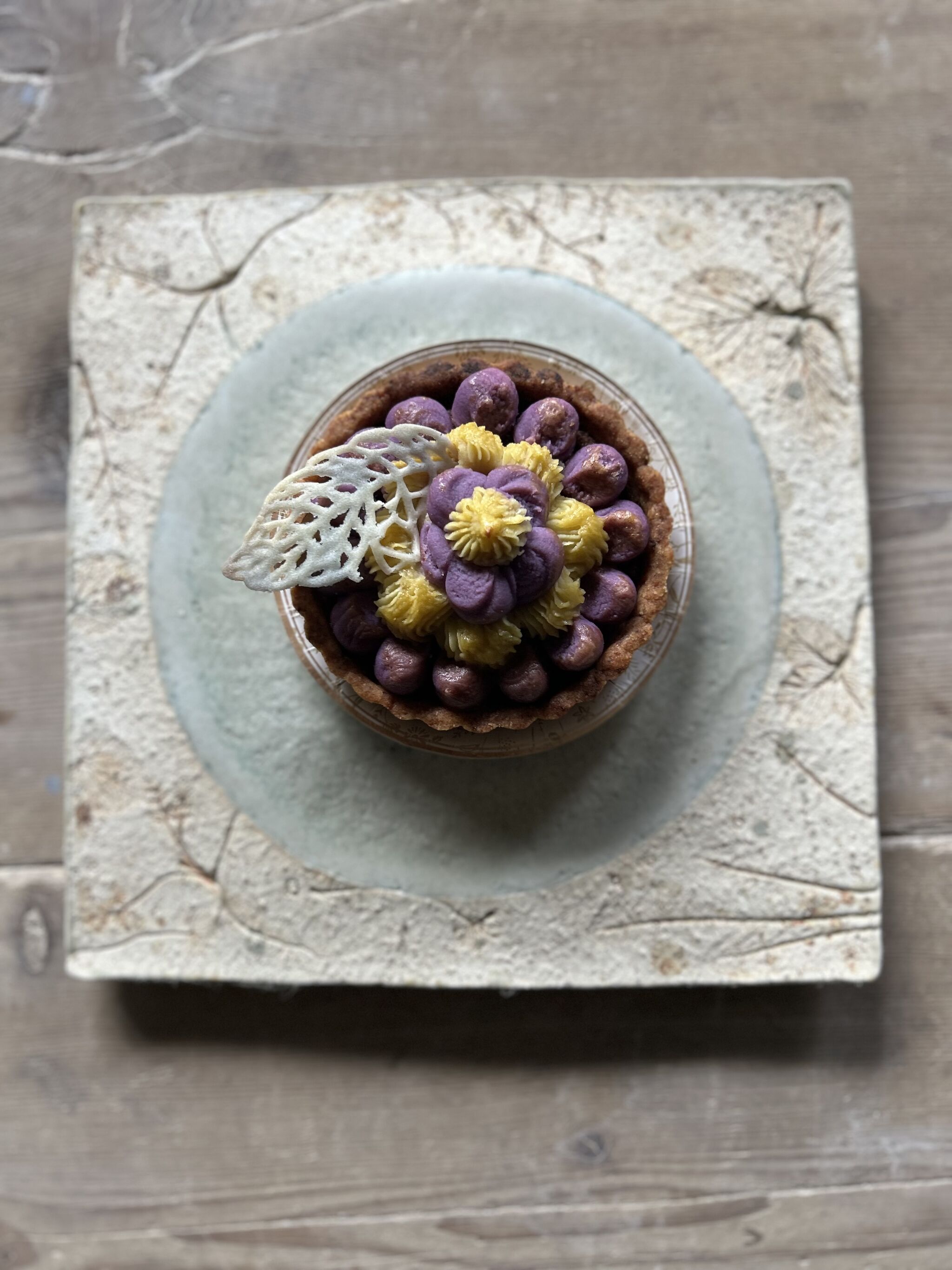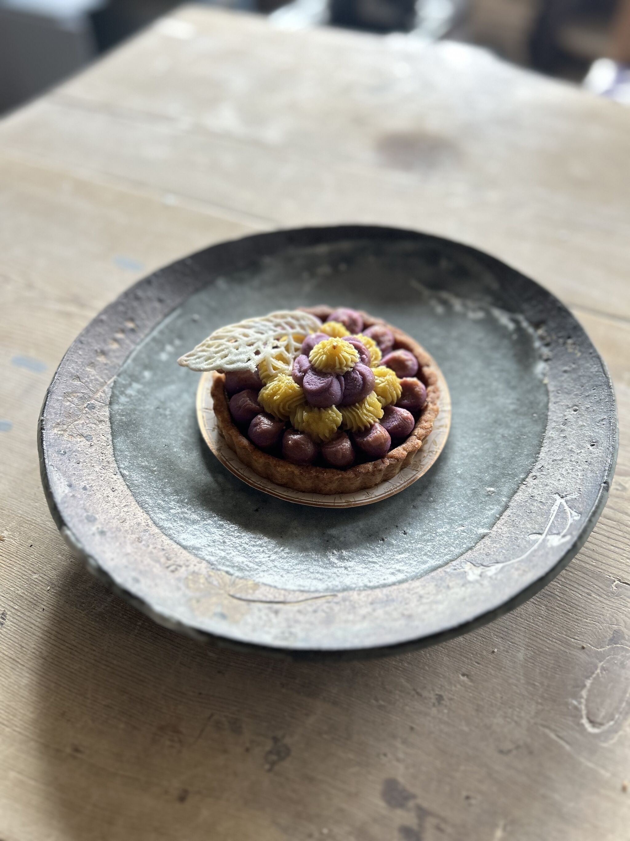 今回は琴絵さんの日本画に細かく描かれたレースにちなんで、葉っぱのレースをちょこんとあしらった2色のスイートポテトタルトでした。