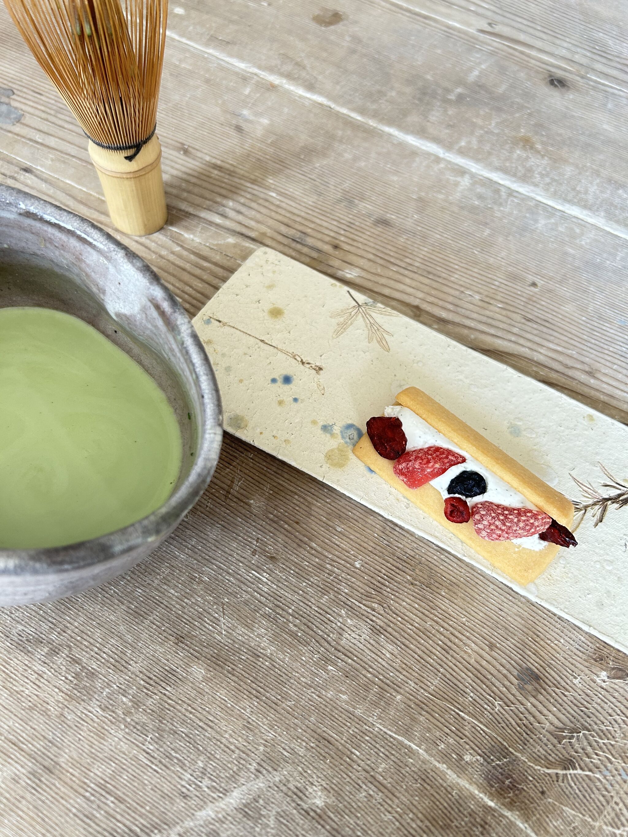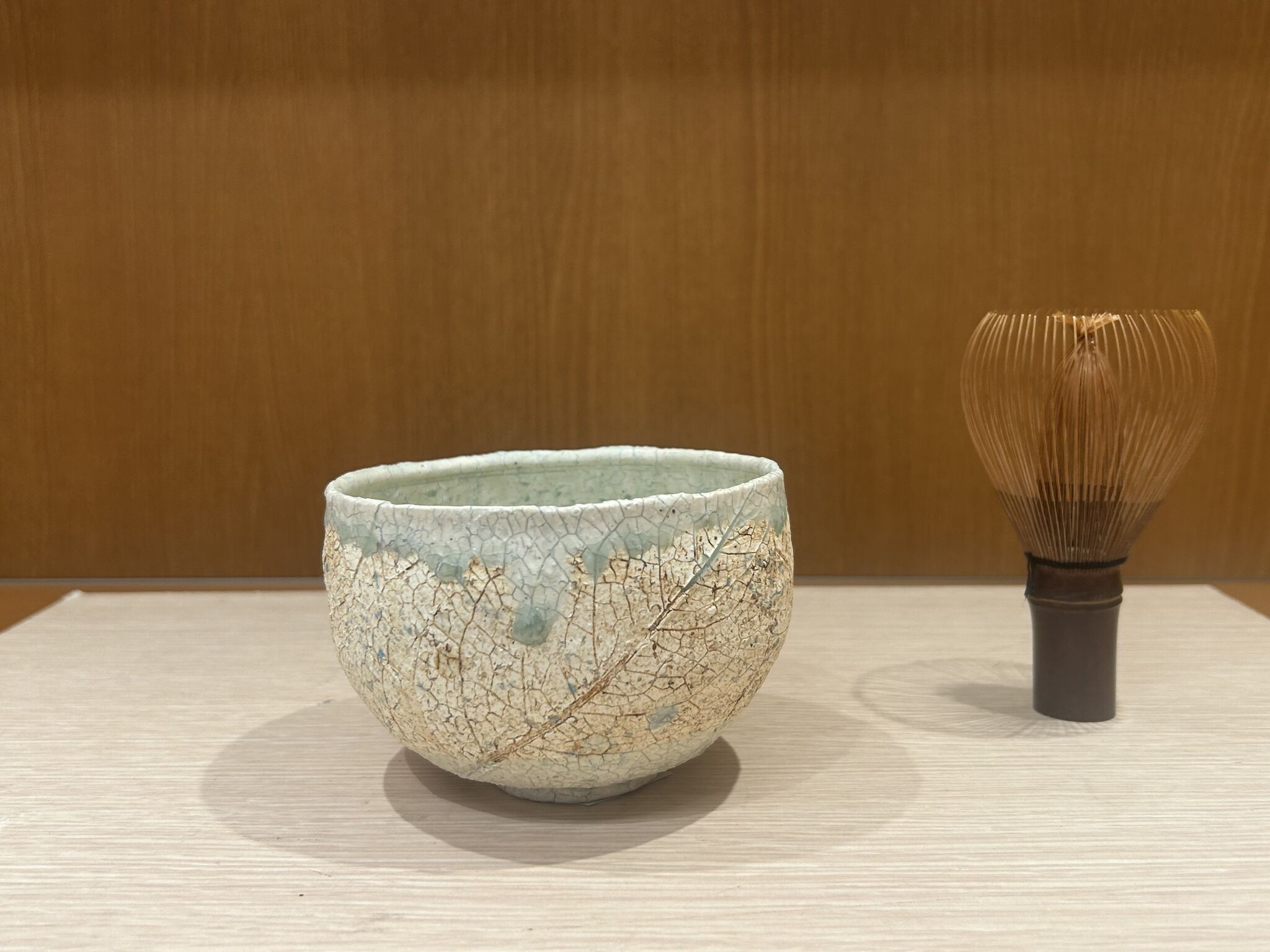 抹茶と言ってもほんとにカジュアルに「抹茶ごっこ」みたいな感じです。寒いから牛乳を冷蔵庫から出して仕事場に置いておけるから抹茶ミルクにできるのが便利です。もちろんホットでいただきます。茶筅でシャカシャカ泡立てるとそれらしく気持ちも上がります。かわいいお茶菓子は友人からの差し入れです。家では安価でしかもだいぶ年季の入った茶筅(画像のやつ)を使っていて、展示にも持って行って使ってるんですけど、今回偶然宿泊ホテルから出た真ん前にお茶の専門店があってそこで新しく茶筅を買い求めて展示にも使いました